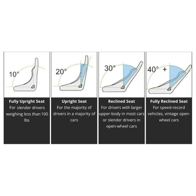 - 30 Degree: Reclined seat, for drivers with a larger upper body in most cars, OR drivers with slim bodies in open wheeled cars.